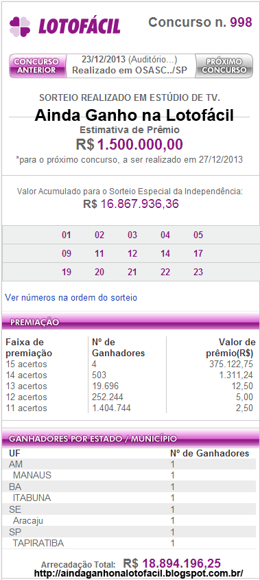 Resultado lotofácil concurso 998 do dia 23/12/2013 foram...